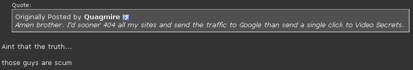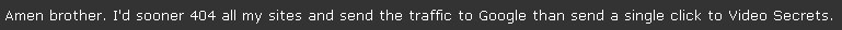 “Amen brother, I would soon 404 all my sites and send the traffic to Google than send a single click to Video Secrets.” That’s pretty harsh for a program who just won a awards based on the ethics of their business practices don’t you think?