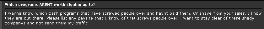 On the popular Playboy owned “GFY” or Go Fuck Yourself adult forums, a webmaster asked ” Which programs AREN’T worth signing up to? I wanna know which cash programs that have screwed people over and haven’t paid them. Or shave from your sales.“