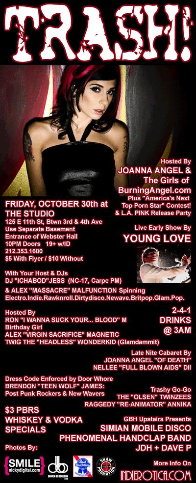 Brooklyn, NY and Los Angeles, CA/ HALLOWEEN 2009 – Queen of Alt Porn and BurningAngel (www.burningangel.com) founder Joanna Angel will be hosting the annual Trash Party at The Studio in NYC on Friday, October 30th 2009 and will also be appearing at Smack!’s Annual Halloween Fetish Ball on Saturday, October 31st 2009.