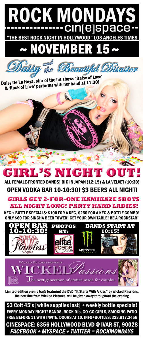 Wicked Pictures is pleased to invite ladies across Southern California to join VH1 star Daisy De La Hoya for a “Girl’s Night Out” this Monday, November 15th at Cinespace in Hollywood, California. Beginning at 10:00 PM, this night of exuberant girl power will feature female-fronted bands, cute go-go girls, free candy and two-for-one drink shots for the ladies. And it will all be in celebration of It Starts With A Kiss, the debut release from Wicked Passions, the sensual new line of erotica for couples from Wicked Pictures. Cinespace is located at 6356 Hollywood Boulevard.