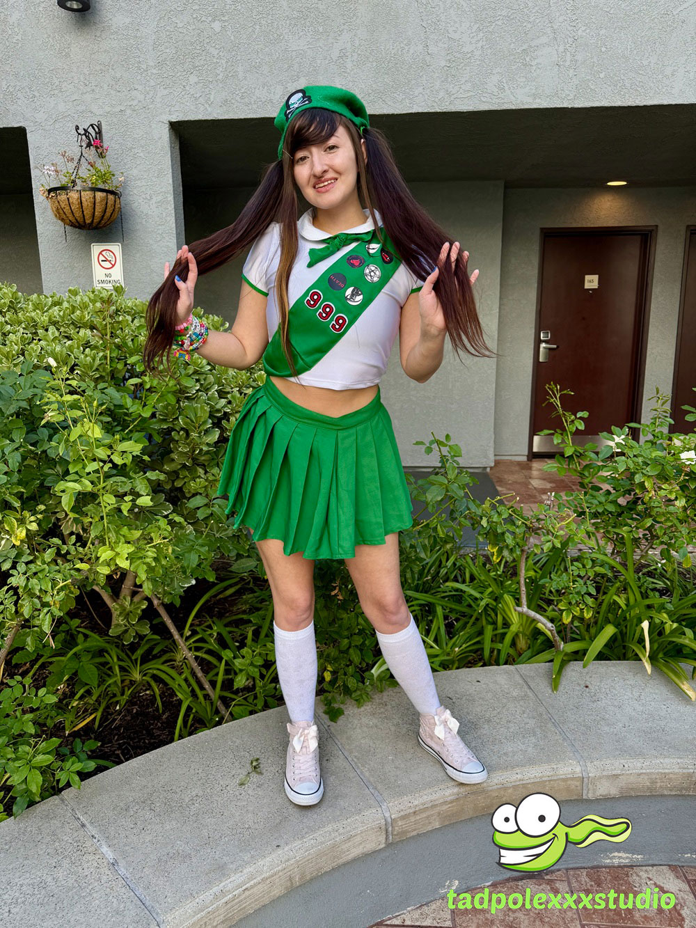 TadpoleXStudio has a hot new double creampie scene out starring lovely young slut Tifa Quinn. Dressed in her version of a Girl Scout uniform, the delightful diva is selling creampie cookies. She and Wolf take Tad to a hotel room to show off her sales skills. He talks her into working for him, peddling his movies. One look at the box cover is all it takes for the petite, 4’11’ stunner to beg to be in one herself!