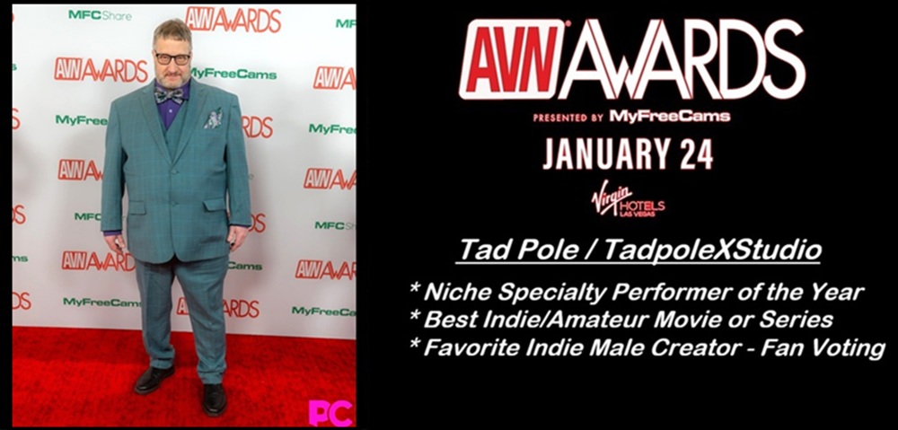 LAS VEGAS, NV—Tad Pole, owner of TadpoleXStudio, has earned another nomination for the upcoming AVN Awards, this time in the fan voting category Favorite Indie Male Creator. The humble performer, producer, and director could not hold back his joy and appreciation at being included on the prestigious list. He shared his joy and is asking fans to help him take home the trophy!